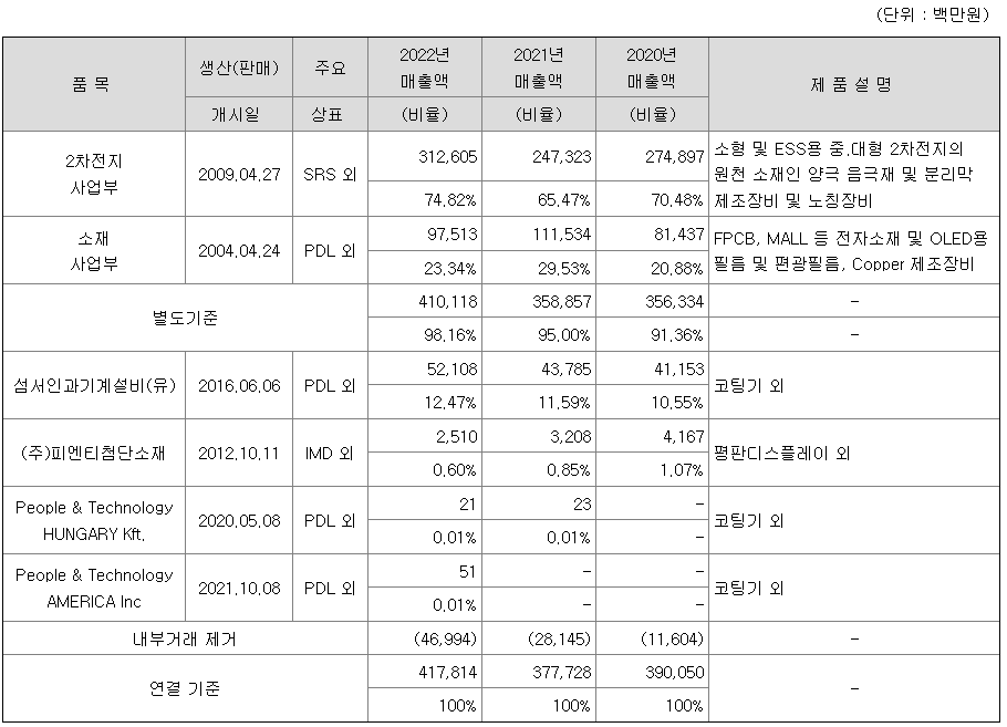 소재사업부는 전지박(동박), 광학필름, OCA 필름 등 각종 디스플레이 소재용 특수 필름 및 전자/전기 소재를 생산하는 장비 등을 생산하고 있습니다.