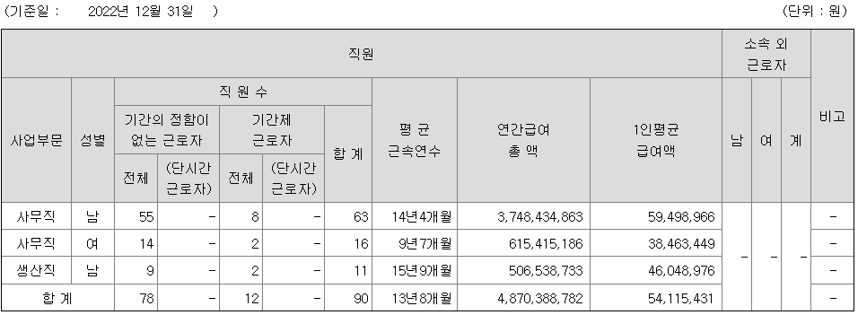| 사업부문 | 성별 | 직원수 | 평균근속연수 | 평균연봉(백만) |