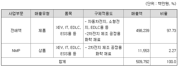 당사는 2차전지 및 EDLC용 전해액, 첨가제를 제조 및 판매하는 사업을 영위하고 있습니다.