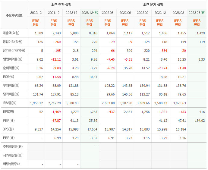 2022년 매출은 5098억, 영업이익은 154억, 당기순이익은 218억입니다. 그리고 영업이익률은 3.01%입니다.