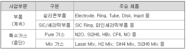 당사의 사업분야는 반도체 등의 제조공정에 사용되는 실리콘 부품(Si-Parts)사업과 신규사업인 실리콘카바이드사업(SiC-Parts)으로 구성되며, 이는 반도체의 핵심 제조공정인 에칭(식각)공정에 사용되는 소모성 부품입니다. 최근 반도체 공정에서의 고집적도를 위한 선폭 미세화에 따른 고밀도 플라즈마 환경의 도입과 Dry Etching 공정의 확산으로 중요성이 더욱 부각되고 있습니다.