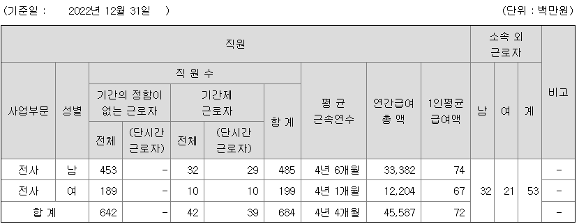 | 사업부문 | 성별 | 직원수 | 평균근속연수 | 평균연봉(백만) |