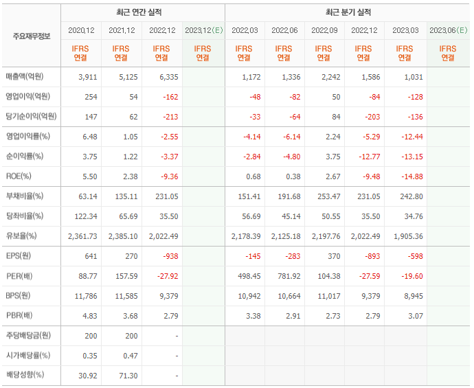 2022년 매출은 6335억, 영업이익은 -162억, 당기순이익은 -213억입니다. 그리고 영업이익률은 -2.55%입니다.