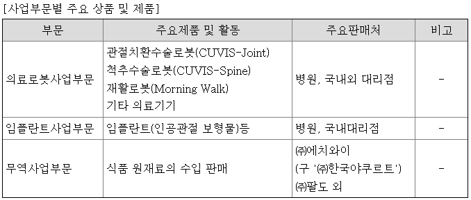 당사는 의료로봇사업부문, 임플란트사업부문 및 무역사업부문으로 구성되어 있습니다. 의료로봇사업부문은 정형외과 수술로봇인 '큐비스-조인트(Cuvis-joint)', '큐비스-스파인(Cuvis-spine)', 재활치료로봇인 '모닝워크(Morning Walk)' 및 기타 의료기기를 판매하고 있으며, 임플란트사업부문은 인공관절보형물인 임플란트 판매하고 있습니다. 무역사업부문은 식품원료를 수입하여 판매하고 있습니다.