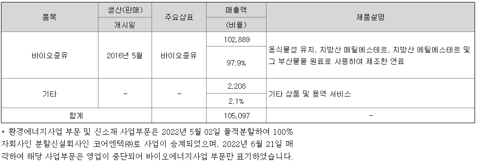 가. 바이오에너지사업부문의 주요 제품 등의 현황