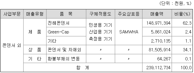 국내 전해콘덴서 시장은 당사와 삼영전자공업 등에서 생산을 하고 있으며 동남아시아와 중국의 저가 제품도 수입되어 글로벌 경쟁 체제하에 있습니다. 하지만 5G통신과 자동차 부분은 고품질 및 고특성을 요구하는 시장으로서, 당사는 품질 및 기술우위의 정책으로 사업 경쟁력 강화와 성장기반을 마련하고 있습니다.