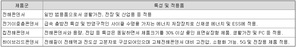 제품의 특성별로 전해콘덴서, 전기이중층콘덴서, 칩전해콘덴서, 하이브리드콘덴서 등 제품군으로 구별하고 있습니다.