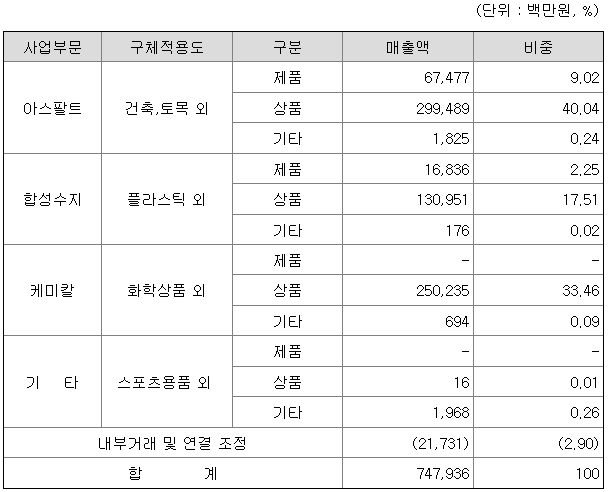 당사의 연결회사는 아스팔트부문, 합성수지부문, 케미칼부문 총 3개 사업부문 체재로 운영되고 있습니다. 사업부문별 법인과 주요제품 및 서비스는 다음과 같습니다.