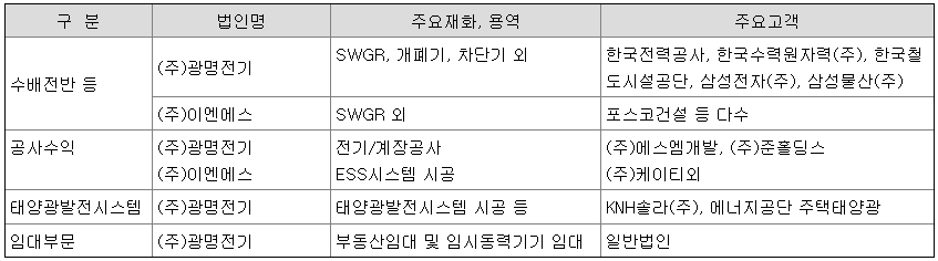 (주)광명전기와 종속회사는 수익을 창출하는 재화와 용역의 성격,이익 창출단위, 제품 및 제조공정의 특징,시장 및 판매방법의 특징,사업부문 구분의 계속성 등을 고려하여 경영의 다각화 실태를 적절히 반영할 수 있도록 연결실체를 수배전반 부문, 공사수익 부문, 태양광발전시스템 부문, 임대 부문의 4개 사업 부문으로 구분 하였습니다.