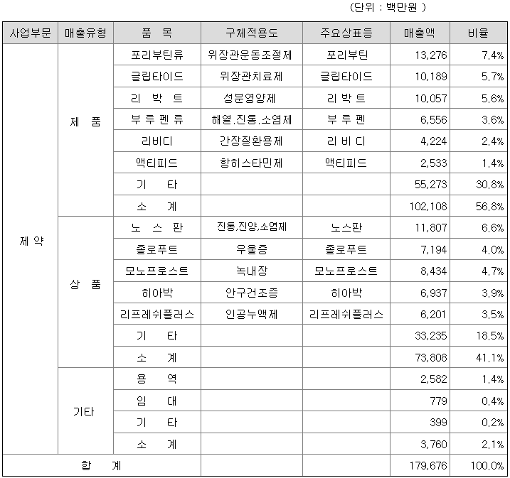 당사 및 종속회사의 주요 매출은 제약부문, 기타부문으로 구분할 수 있습니다. 공시대상기간 동안사업부문별 매출은 다음과 같습니다.