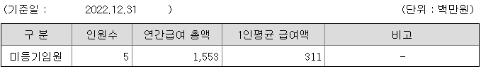 미등기임원의 평균연봉은 3억 1100만원이고 직원수는 5명입니다.