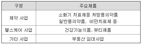 회사의 사업부문은 제약 사업과 헬스케어사업, 기타 사업으로 구분하고 있습니다.