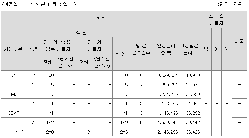 | 사업부문 | 성별 | 직원수 | 평균근속연수 | 평균연봉(백만) |