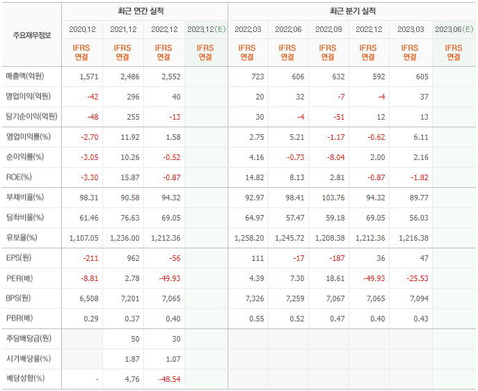 2022년 매출은 2552억, 영업이익은 40억, 당기순이익은 -13억입니다. 그리고 영업이익률은 1.58%입니다.