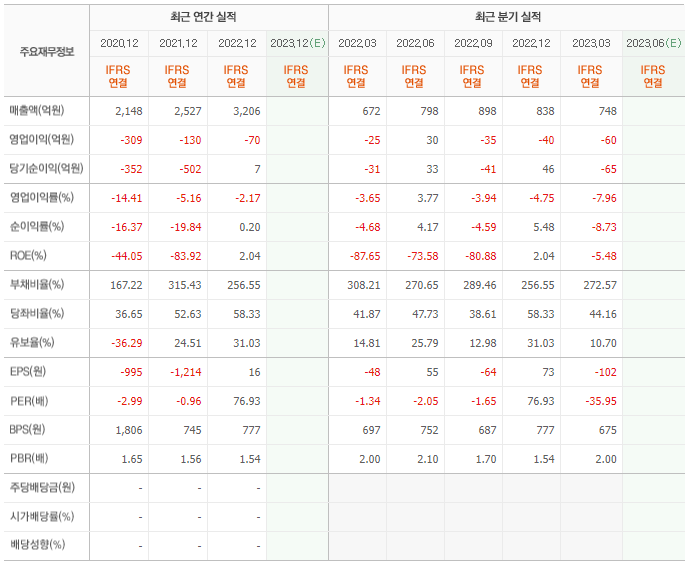 2022년 매출은 3206억, 영업이익은 -70억, 당기순이익은 7억입니다. 그리고 영업이익률은 -2.17%입니다.