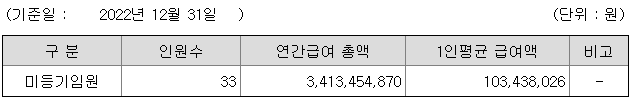 미등기임원의 평균연봉은 1억 300만원이고 직원수는 33명입니다.