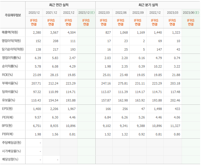 2022년 매출은 4504억, 영업이익은 111억, 당기순이익은 193억입니다. 그리고 영업이익률은 2.47%입니다.
