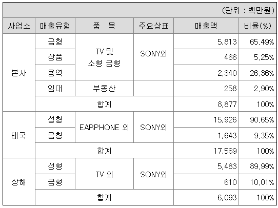 세계경제의 침체에 따른TV제품 매출의 감소와 가격 경쟁이 본격화되면서 당사 주력부분인TV관련 금형 및 사출 매출이 크게 감소하였습니다. 당사는 이러한 불리한 영업환경을 극복하기 위하여 기술집약적인 소형, 정밀금형, Audio금형 등 신규 제품 영업활동을 지속적으로 경주하고 있습니다.