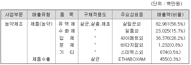 회사의 주요 매출 제형으로 유액제, 수화제, 입제 등이 있으며 유액제와 입제가 매출의 50%이상을 차지하고 있습니다. 주요 품목으로는 나방약 모스킬액상수화제, 진딧물약 스트레이트입상수화제, 무름병약 일품수화제, 갈색무늬병약 살림꾼액상수화제,응애약 다이마이트 분산성액제 등이 있습니다.