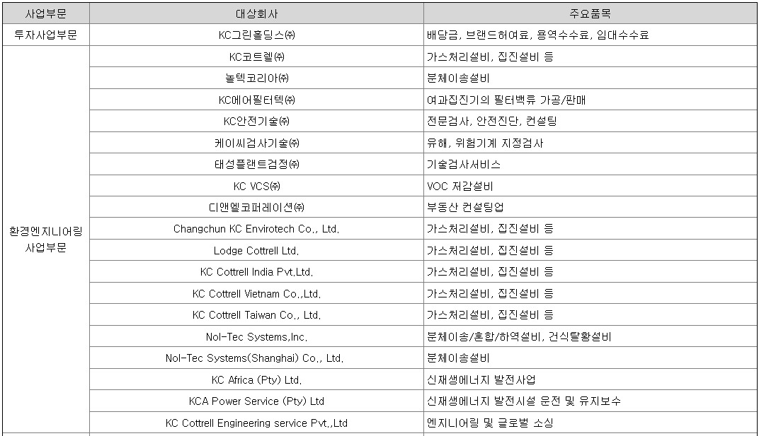 당사의 대기오염방지 환경엔지니어링 사업부문은 1973년부터 49년간 국내외 유수의 기업들과 경쟁하면서 고객에 대한 신뢰와 기술력확보를 통해 전세계가 인정하는 역량과 경쟁력을 확보했습니다. 당사의 해외 관계회사 중 Lodge Cottrell Ltd.(영국)은 우수한 수주 레퍼런스를 통해 뛰어난 영업능력을 보이고 있으며, Changchun KC Envirotech Co., Ltd.(중국)의 원가 경쟁력과 Nol-Tec Systems Inc.(미국)이 보유한 원천기술로 관계사 간의 네트워크를 통해 효과적으로 시장을 선점하여 관리하고 있습니다.