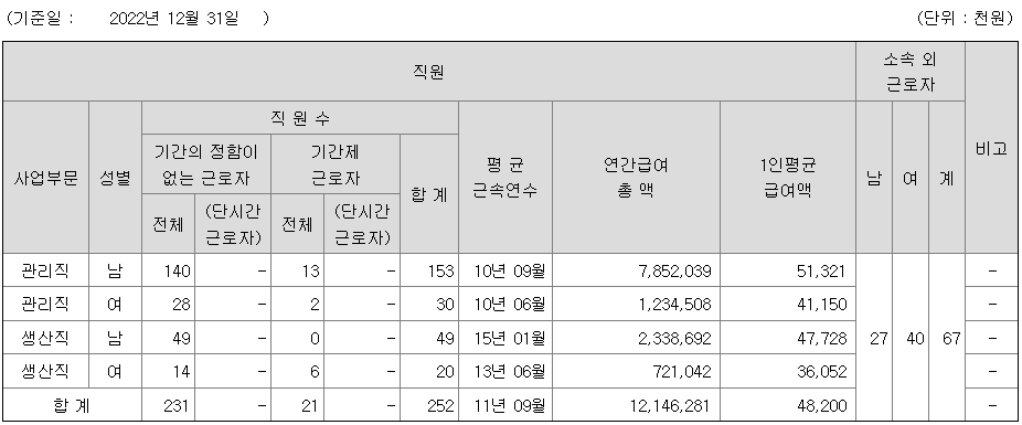 | 사업부문 | 성별 | 직원수 | 평균근속연수 | 평균연봉(백만) |