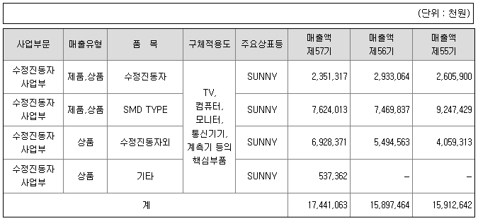 수정진동자의 경우, 주요 고객은 삼성전자, 엘지전자 등 국내 주요 세트업체이며, 각 고객사의 국내외 생산공장에 공급이 이루어집니다. 회사는 장기 성장잠재력 확충을 위해 연구개발 조직을 설치, 운영하고 있습니다. 매출액 대비 연구개발비 지출은 당기의 경우, 0.9%입니다. 전기와 전전기의 경우, 각각1.4%와 1.9%입니다.