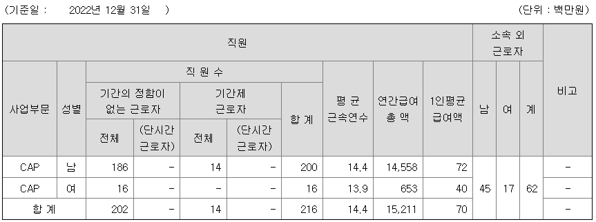 | 사업부문 | 성별 | 직원수 | 평균근속연수 | 평균연봉(백만) |