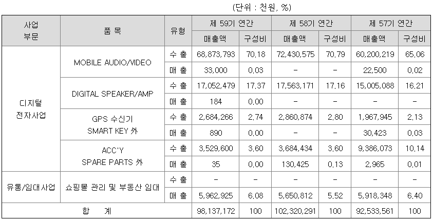 당사 및 종속회사인 Namsung America, Inc(미국현지판매법인)에서 DIGITALAUDIO / VIDEO, XM위성수신 RADIO, DIGITAL AMPLIFIER, WIRELESS HEADPHONE, SMART KEY 등을 미국 등 해외에 판매하고 있는 디지털전자사업부문과 당사와 국내 종속회사인 (주)남성 에이엠디에서의 지식산업센타빌딩인 서울 금천구 가산동의 남성프라자, 구로구 구로동의 크라운프라자의 부동산임대사업 부문, 그리고 서울시 시흥 동의 PLAZA CAMELLIA 쇼핑몰 및 면목동의 CAMELLIA 면목점을운영하고 있는 유통/임대 사업부문이 있습니다.