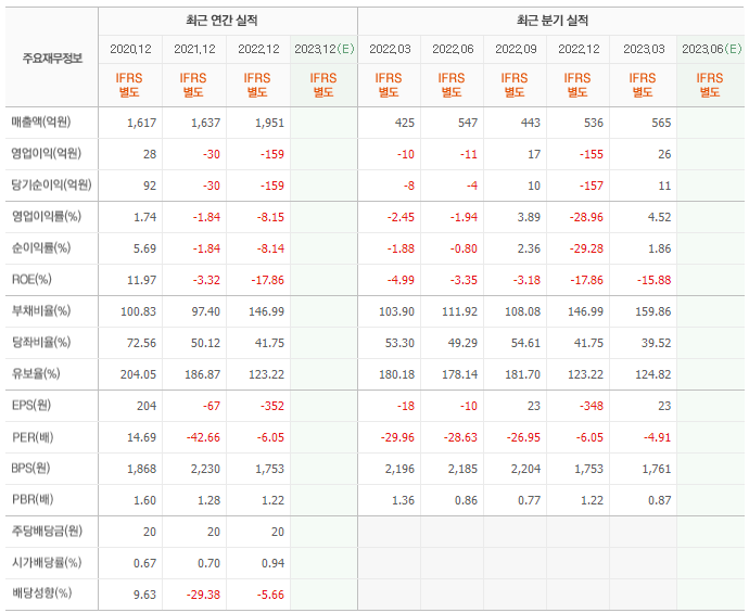 2022년 매출은 1951억, 영업이익은 -159억, 당기순이익은 -159억입니다. 그리고 영업이익률은 -8.15%입니다.