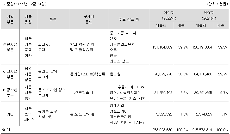 지배회사는 1997년 '비유와상징'이라는 교육출판 전문회사로 출발하였으며, 따라서 출판 사업 부문은 당사 사업의 모태가 되는 사업 부문입니다. 보고서 제출일 현재 출판 사업 부문의 주요 제품 및 서비스에는 초등 국정 교과서, 초ㆍ중ㆍ고등검인정 교과서, 국어 교재 '한끝', 과학 교재 '오투', 수학 교재 '개념플러스유형', 영어 교재 '리더스뱅크', 교원 대상 교수학습 지원 사이트 '비바샘' 등이 있습니다. 해당 사업 부문의 2022년 매출은 1,512억원으로 당사 연결기준 매출의 59.7%를 차지하고 있습니다.