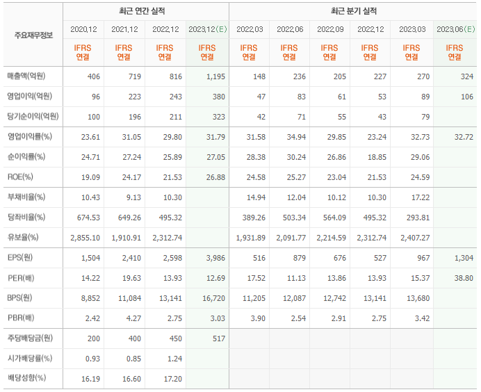 2022년 매출은 816억, 영업이익은 243억, 당기순이익은 211억입니다. 그리고 영업이익률은 29.80%입니다.