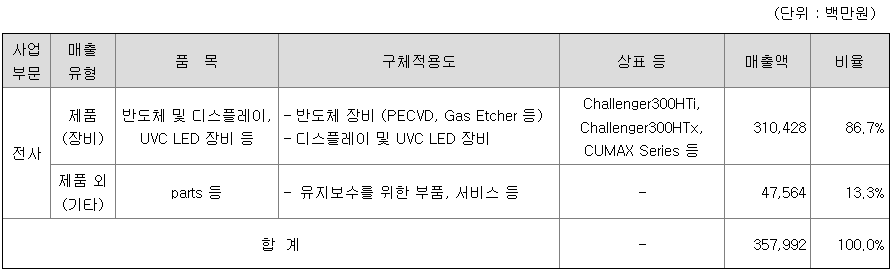 당사는 크게 반도체 장비 등 장비 부문과 부품, CS매출 등 기타 부분으로 매출을 구분할 수 있으며, 각 제품별 매출액 및 매출액에서 차지하는 비율은 다음과 같습니다.