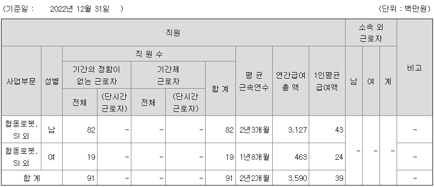 | 사업부문 | 성별 | 직원수 | 평균근속연수 | 평균연봉(백만) |