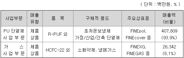 사업군별로 보면 PU단열재사업부에서는 ① Polyurethane 계열의 LNG운반선 및 LPG운반선 화물창, LNG추진선의 LNG연료탱크, 가스운반선 및 플랜트용 파이프, 육상용 가스보관탱크 등에 사용되는 초저온보냉재 부문과 ② 가전/산업/건축용 단열재 등에 사용되는 Polyurethane 및 Polyol을 생산, 판매하는 PU System부문이 있습니다. GAS사업부문에는 ① HCFC계열, HFC계열, HFO계열 등 불소 냉매를 수입, 소분, 판매하는 냉매사업부문과 ② 불연소 가스를 기체 형태로 방출하여 화재를 소화시키는 GAS계 소화설비를 생산·판매하는 방재사업부문이 있습니다.