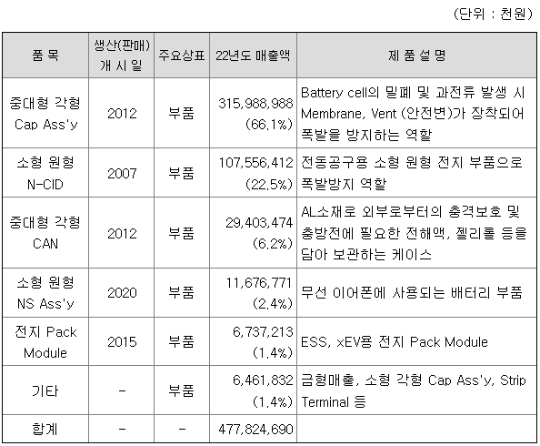 당사는 소형전지, 자동차전지, ESS 등의 리튬이온 2차전지에 들어가는 안전관련부품을 생산/판매하는 2차전지 사업부문을 영위하고 있습니다.