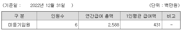 미등기임원의 평균연봉은 4억 3100만원이고 직원수는 6명입니다.