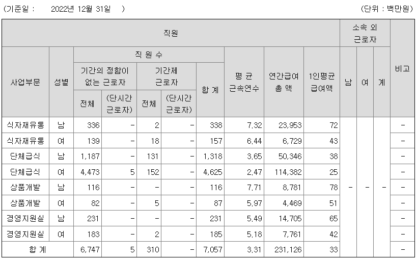 CJ프레시웨이 연봉 2022년 기준 공시자료