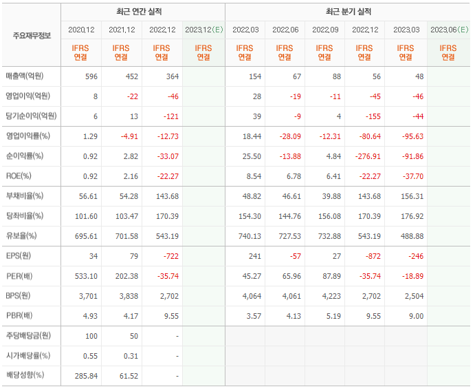 2022년 매출은 364억, 영업이익은 -46억, 당기순이익은 -121억입니다. 그리고 영업이익률은 -12.73%입니다.