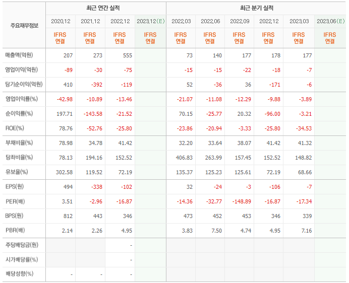 2022년 매출은 555억, 영업이익은 -75억, 당기순이익은 -119억입니다. 그리고 영업이익률은 -13.46%입니다.