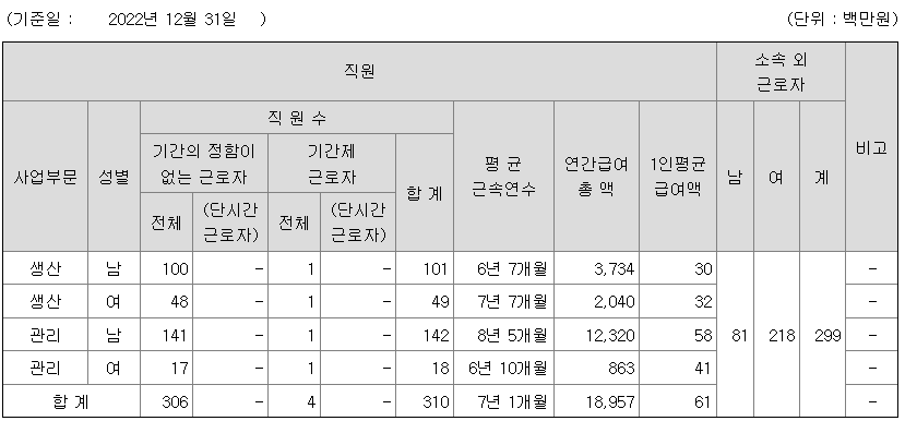 | 사업부문 | 성별 | 직원수 | 평균근속연수 | 평균연봉(백만) |